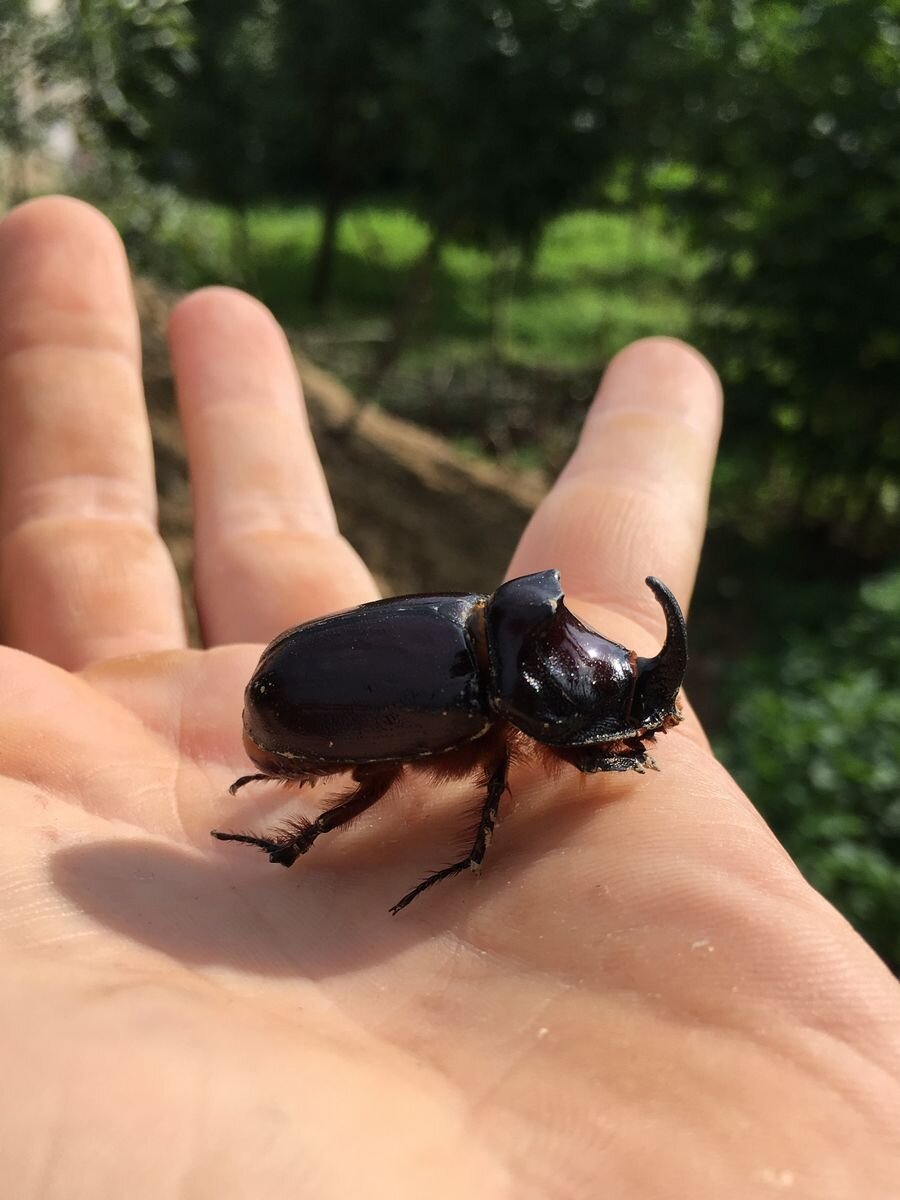 Komposzt gyűjtögetésem hetedik évében megjelent személyes kedvencem, a szintén védett fajnak számító orrszarvúbogár (Oryctes nasicornis), ami az elkövetkező években rendszeres vendéggé vált kertemben. Ez a faj valamikori élőhelyein jellemzően nagyméretű idős tölgyfák korhadásnak indult törzsében és vastag gyökereiben fejlődött.