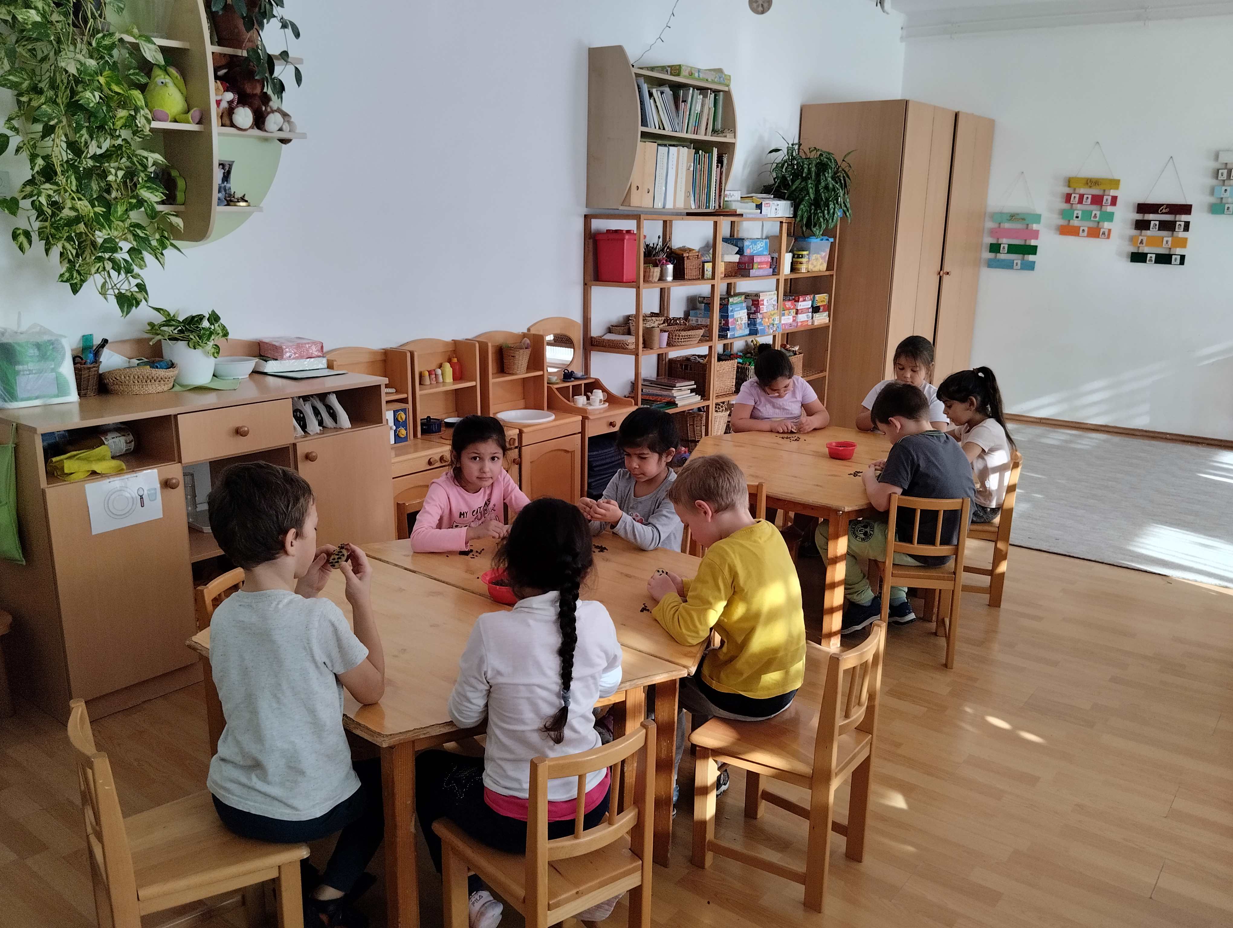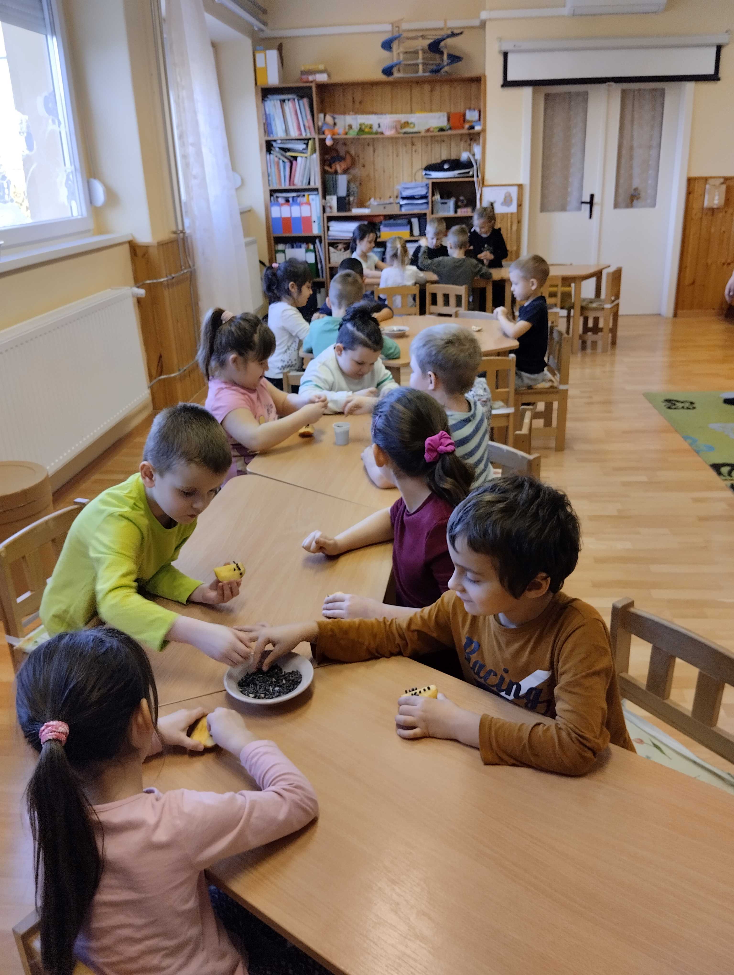 A talajon mozgó feketerigóknak csemegét készítettünk: a gyerekek almadarabokba apró fekete napraforgómagokat szúrtak, majd azokat elhelyezték az óvoda udvarán található bokrok tövébe, a kertes házban élő gyerekek pedig hazavitték az elkészült finomságot.