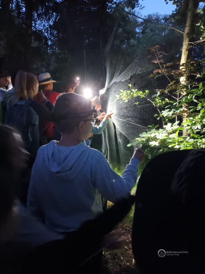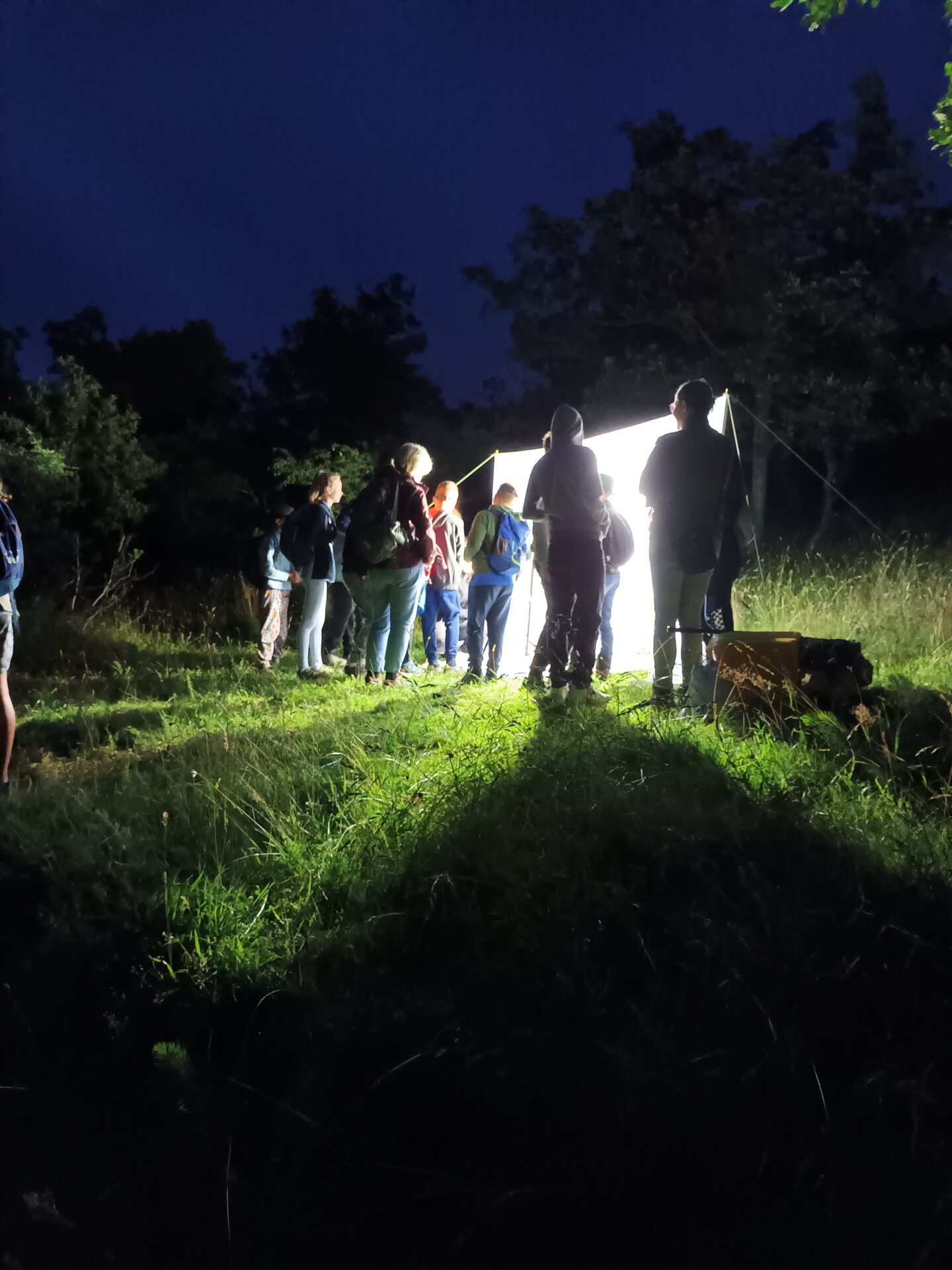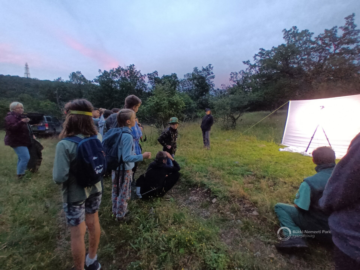 Este már szerencsénkre kegyes volt hozzánk az idő, így éjszakai lepkészésre indultunk. Itt Zsupos Vivien természetvédelmi őr kollégánk mesélt a hazánkban előforduló nappali- és éjszakai lepkékről, legfőbb jellemzőikről, majd mutatta be, hogyan is lehet az éjszakai lepkefajokat megfigyelni, mire van ehhez szükség, majd a felállított eszközök segítségével testközelből is megfigyelhettünk néhány fajt.