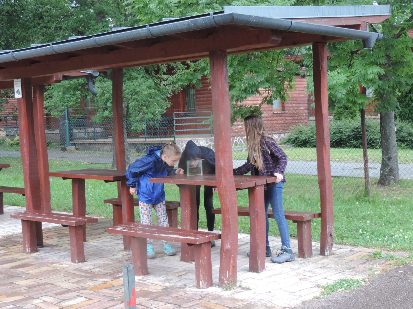 A második napunk kissé máshogy alakult, mint ahogyan elterveztük, hiszen a reggeli esőzés elmosta a délelőtti programunkat, de délután már az időjárás sem szeghette kedvünket, a rossz idő ellenére felkerekedtünk, és a gyerekek megismerkedhettek az Igazgatóságunk legnépszerűbb környezeti nevelési járgányával, a Vidra Verdával és annak vizes moduljával. A program során a Sástó mellett felállított esőbeállók alatt átbeszéltük a vízi makrogerinctelenek szerepét és fontosságát az ökoszisztémában. Szót ejtettünk a foglalkozás alatt használt eszközök helyes használatáról is. Miután láttuk, hogy esélyünk nincs a zavartalanul záporozó eső megúszására, a gyerekek zokszó nélkül felkapták esőkabátjukat – vagy annak híján fejfedőjüket – és természetbúvár módjára máris nekiláttak felfedezni a tó vízi gerinctelen makrofaunáját. Miután megteltek a gyűjtőedények különböző kis csigákkal, gyűrűsférgekkel, bolharákokkal, víziskorpiókkal, kérész-, szitakötő-, és szúnyoglárvákkal, ismét összekuporodtunk az esőbeállók alatt, majd nagyítók és kivetítő használatával megfigyeltük a talált fajok jellemzőit, valamint határozótábla segítségével megállapítottuk rendszertani hovatartozásukat. A véletlenül hálóba került (gerinces) csukaivadékot külön akváriumba helyeztük, mielőtt a többi élőlénnyel együtt visszaengedtük élőhelyükre, Magyarország legmagasabban fekvő tavába. A kutatómunka után jött a jól megérdemelt játék. A foglalkozás végszavára az eső is alábbhagyott, így új ismeretekkel és gyakorlati tapasztalatokkal felvértezve bandukolhattunk vissza a táborhelyünkre.