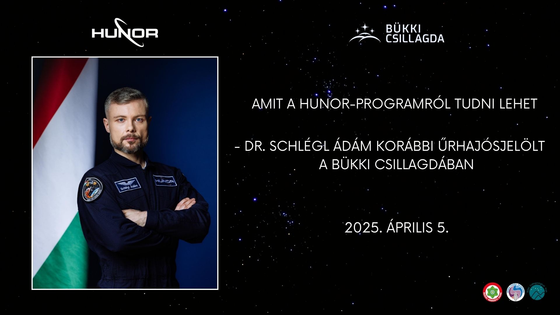 Különleges eseményre invitáljuk az érdeklődőket 2025. április 5-én, szombaton, 19:00 órától: Dr. Schlégl Ádám, korábbi űrhajósjelölt érkezik a Bükki Csillagdába, hogy a HUNOR - Magyar Űrhajós Programról tartson előadást. Az egy órás prezentációt követően közös fotó készítésére és dedikálásra is lesz lehetőség, majd esti csillagászati megfigyelésre kerül sor előadónk részvételével.
