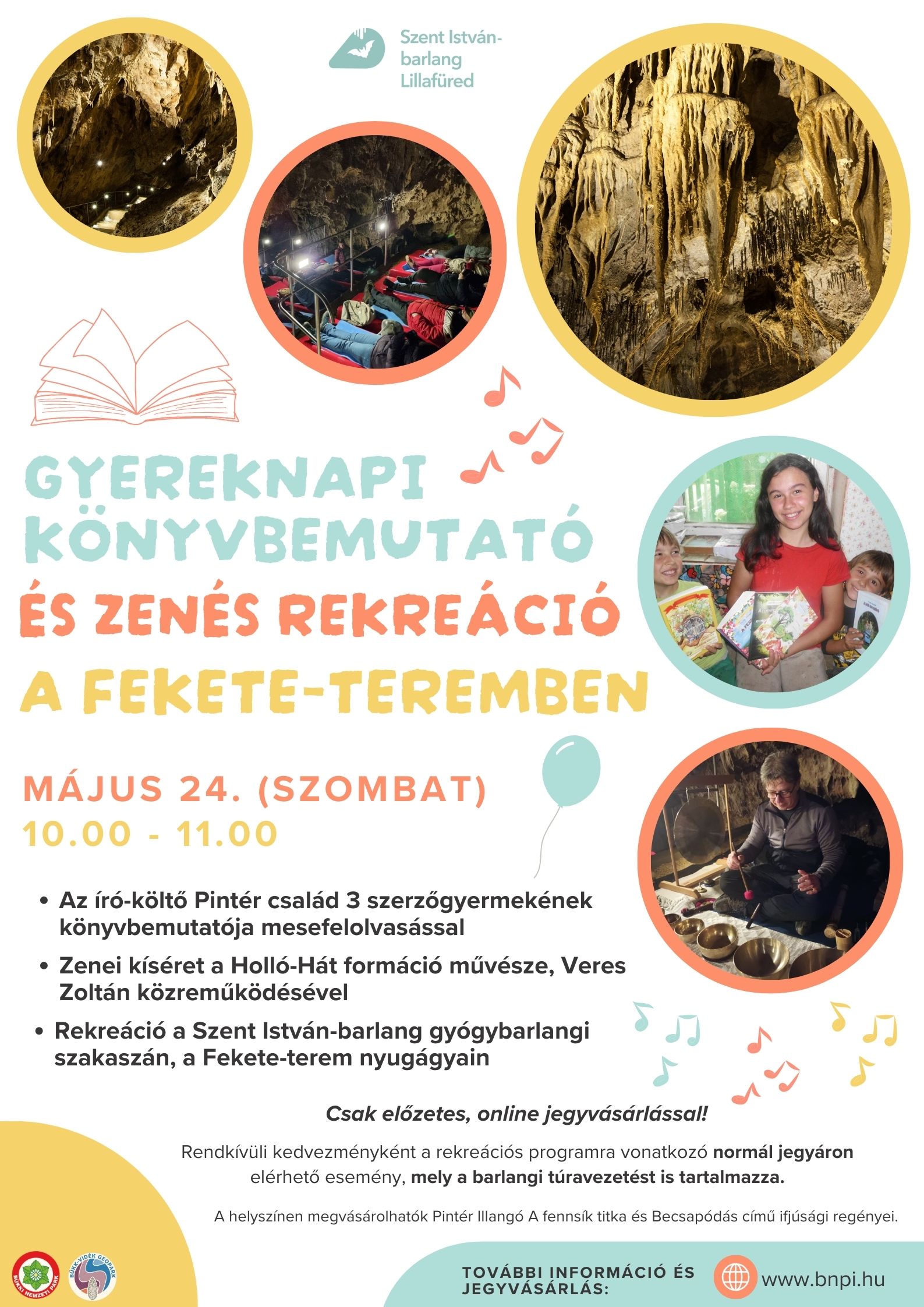 Egyedülálló programra invitáljuk a gyermekeket, szülőket, családokat május 24-én, szombaton, 10 órától a Szent István-barlangba: a kortárs magyar író-költő, több szakmai díjjal és elismeréssel is rendelkező Pintér család érkezik hozzánk, hogy a hagyományos Fekete-termi rekreációs programot mesefelolvasással színesítsék.