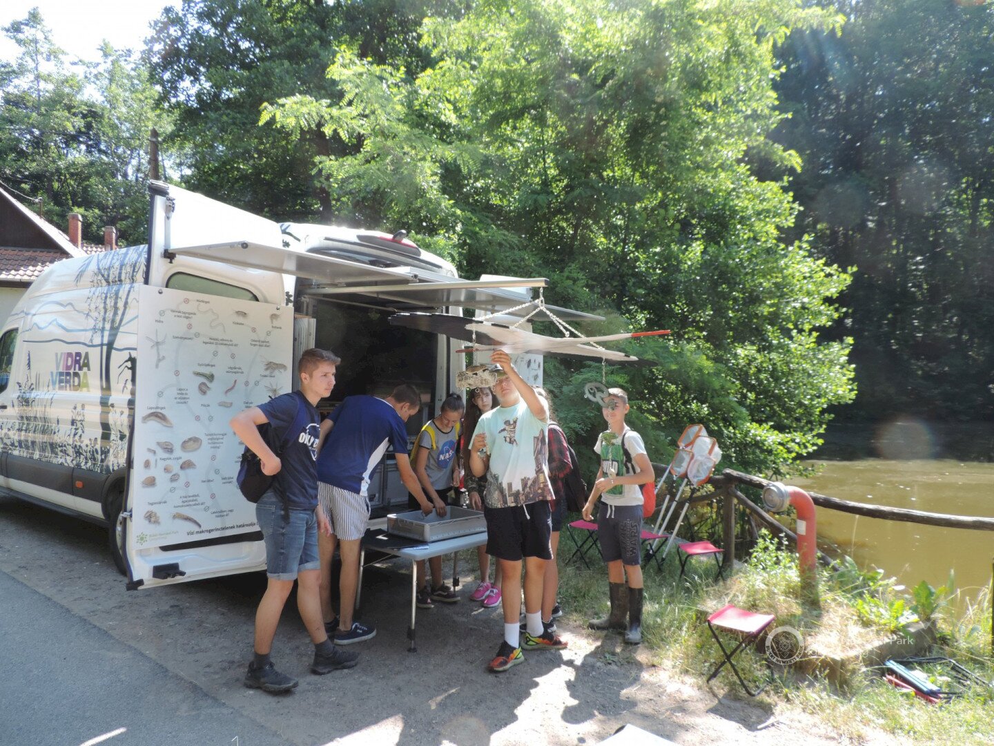 A foglalkozás során megismerkedünk a félelmetes szitakötőlárvával, a tekergő szúnyoglárvákkal, a vizet „taposó” molnárpoloskákkal, valamint számtalan fura kinézetű állattal, amelynek a víz az otthona. Utánajárunk annak, hogy mi az a „víziborjú”, hogyan élnek az eibhalak, és arra is keressük a választ, hogy miért fontos vizeink tisztaságának megóvása. A fehér gólya példáján keresztül szemléltetjük a vizekhez kötődő életközösség sérülékeny és veszélyeztetett voltát, valamint megismerkedünk az oktatóbusz névadójával, a játékos természetű vidrával.